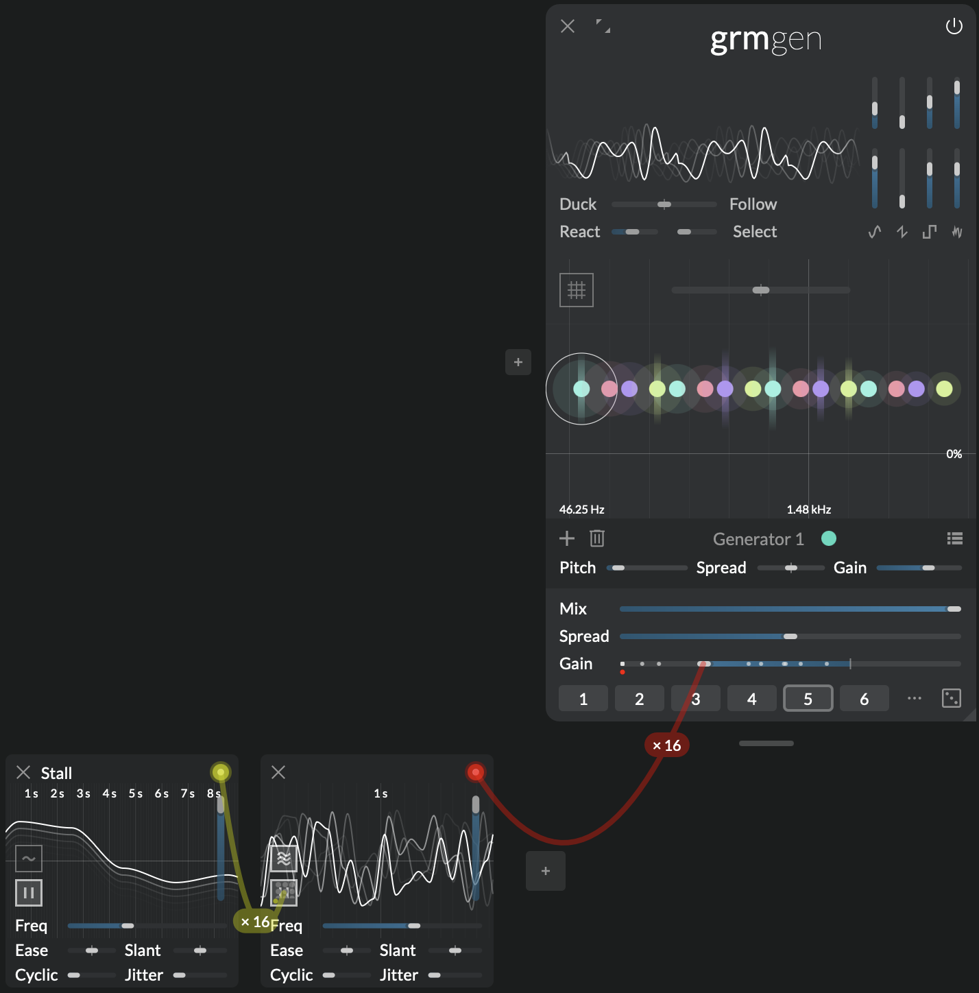 Many parameters in Atelier will benefit from a slow (5-30 seconds-long) and very small (0.1% to 1% amplitude) agitation. A bank of tuned oscillators in Gen will spring to analog life when their frequency Ratio is very slightly agitated. An aggregate of comb filters around 50 Hz will turn from metallic resonance to soft reverberation when Transposition slowly moves. The Feedback of Time, set up with a few taps, will easily be tamed with tiny movements in the delay times (Delay scale).
