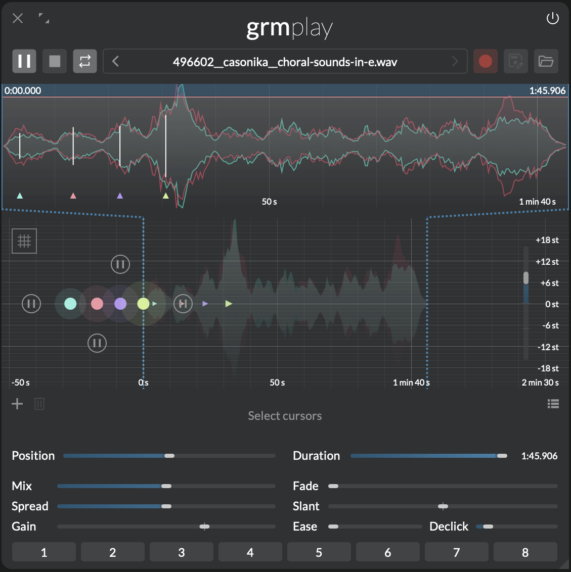 Once a file is loaded, place one or several playheads. Each playhead is represented by a cursor, that has independent pitch, playback position and gain. Its position is confined to a playback region (in blue in the region overview).